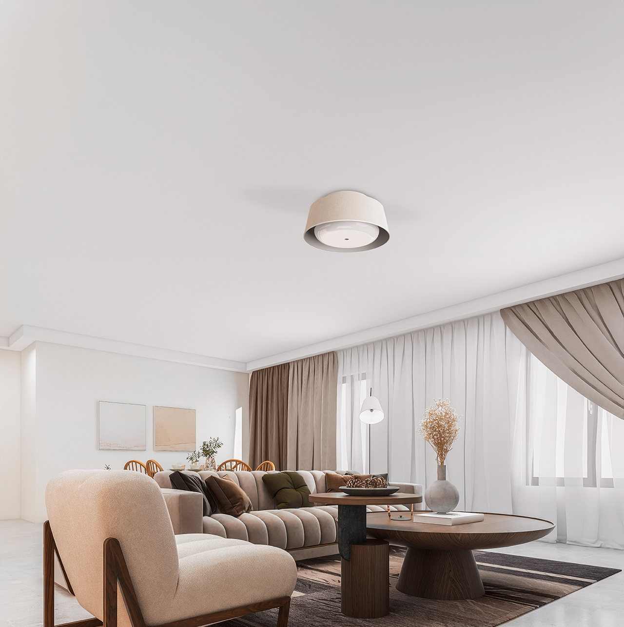 De Nobi Ceiling biedt dezelfde combinatie van elegant design en geavanceerde AI-technologie waar Nobi bekend om staat. De nieuwe plafondlamp wordt aangeboden in twee kleuren - desert en slate - en is net zoals de Nobi Pendant ontworpen voor woon- en slaapkamers. De Nobita, geschikt voor kleinere ruimtes zoals badkamers en keukens, vervolledigt het assortiment.