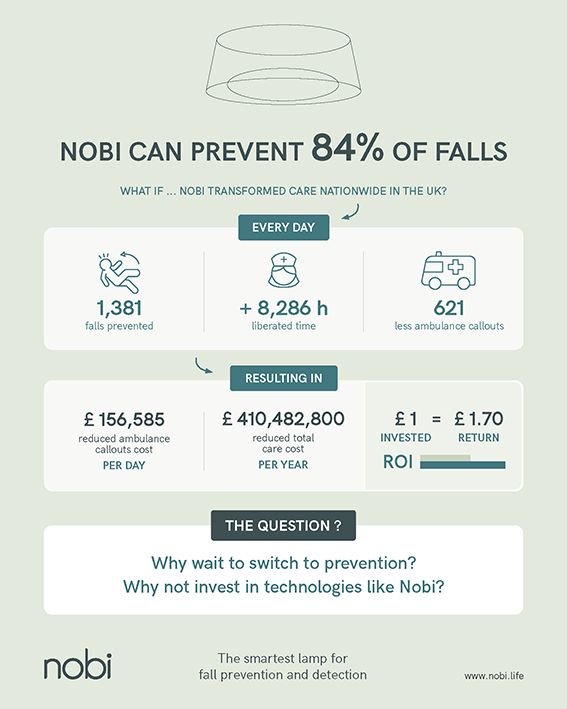 De implementatie van AgeTech-technologie door een woonzorgcentum in Cumbria (Engeland) heeft het aantal valincidenten met 84% verminderd. Als deze resultaten landelijk worden herhaald, zou men in de UK dagelijks 1.381 valincidenten kunnen voorkomen, wat resulteert in aanzienlijk minder ziekenhuisopnames ten gevolge van een val. Deze prestatie zou niet alleen de noodzaak van ambulance-oproepen verminderen, de druk op het personeel verlichten, maar ook de National Health Service (NHS) elke dag £156.585 besparen. De cijfers uit de pilotstudie van Nobi belichten de aanzienlijke impact van hun technologie op valpreventie.