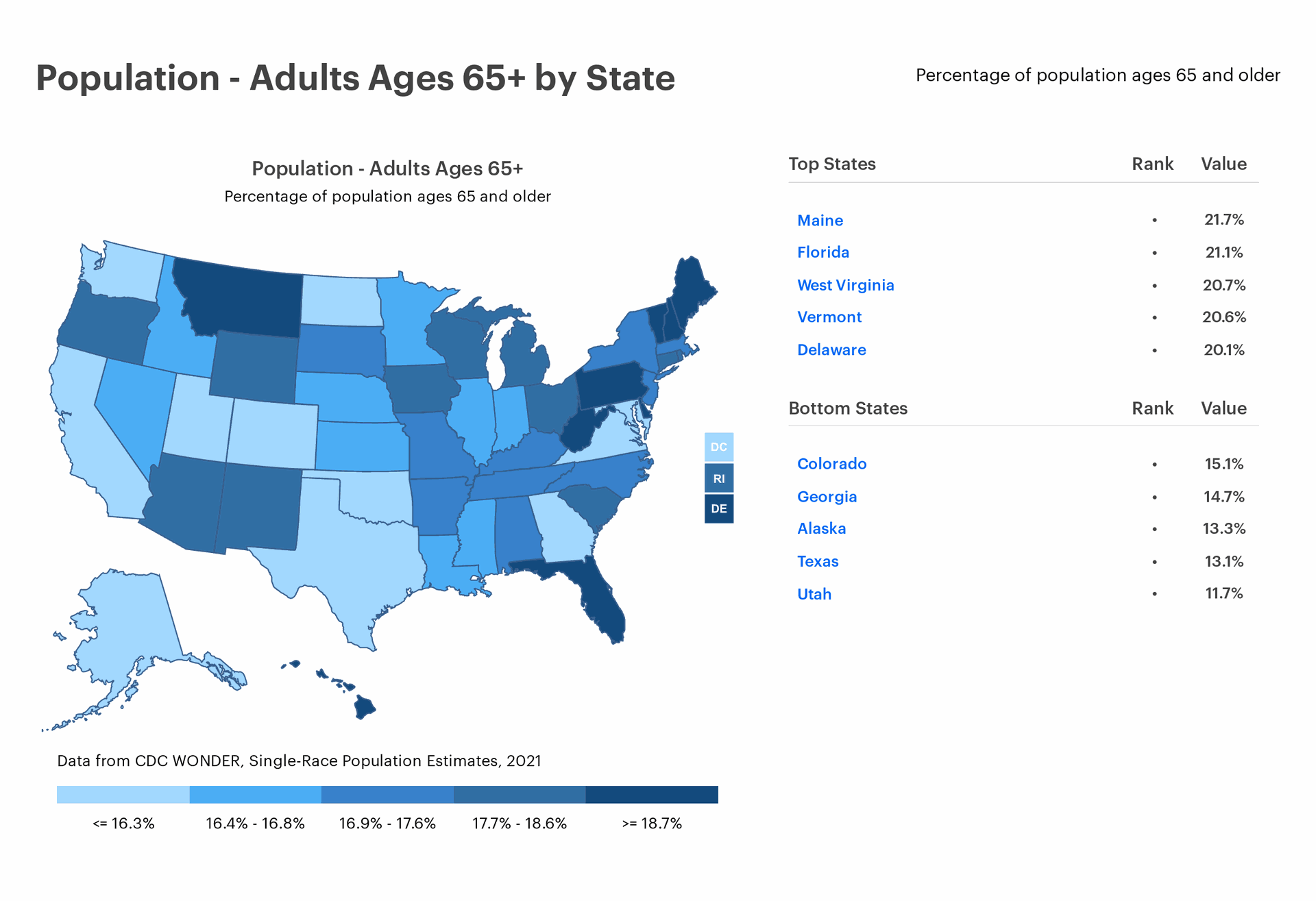De VS staat voor een grote maatschappelijke uitdaging, met name de vergrijzende bevolking. Volgens de jongste officiële cijfers wonen er meer dan 55,8 miljoen volwassenen van 65 jaar en ouder in de Verenigde United Staten. Dat is ongeveer 16,8% van de bevolking. Vermoedelijk zal het aantal nog stijgen tot 22% tegen 2050 – een aanzienlijke toename in vergelijking met 1950, toen slechts 8% van de bevolking 65 jaar of ouder was.