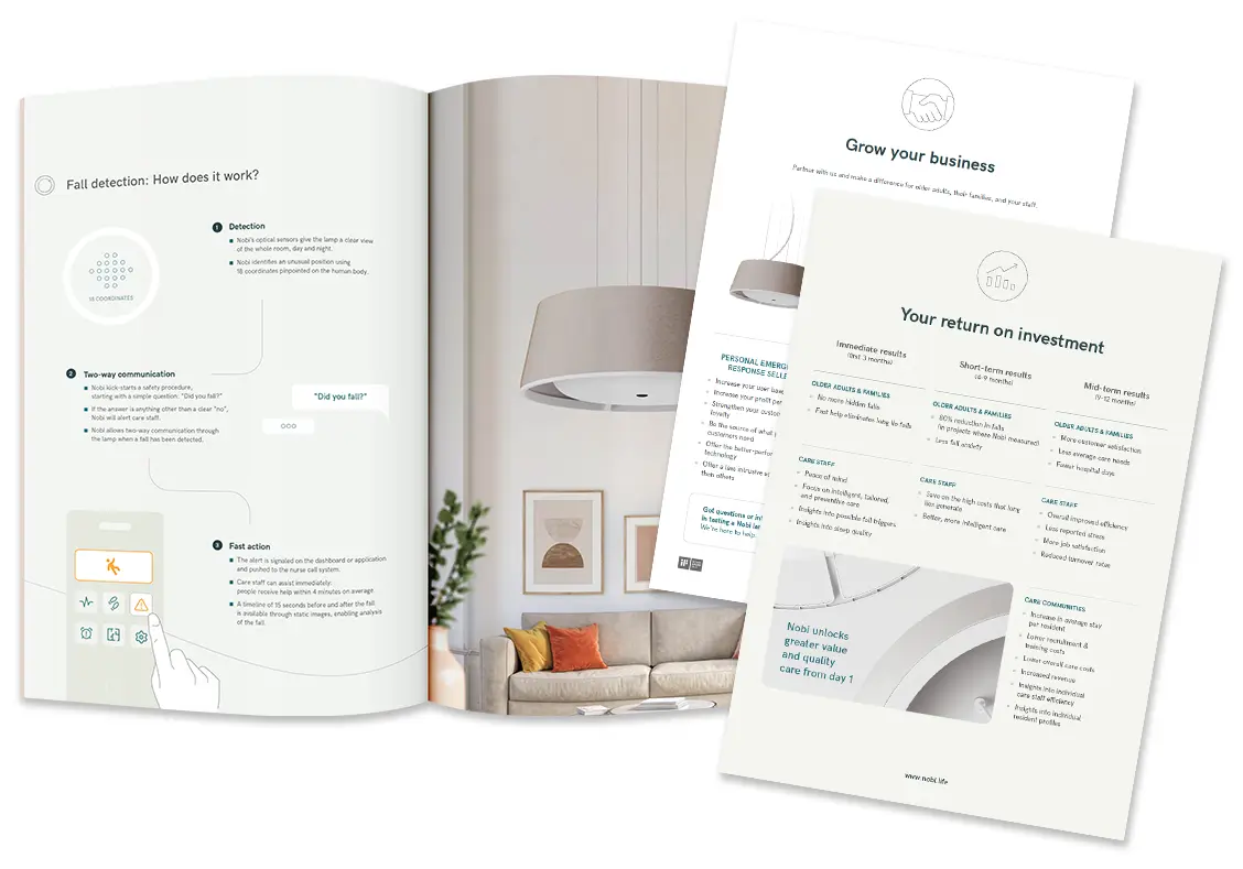 Wil je kennismaken met Nobi? Download onze brochure en ontdek hoe onze slimme designlamp ouderen helpt veiliger en zorgelozer te leven.